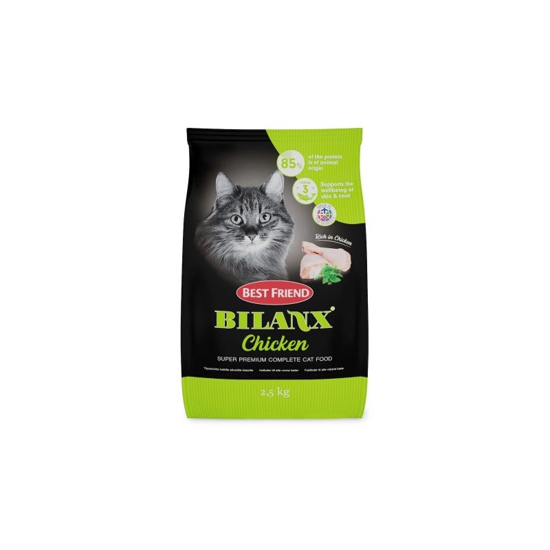 Best Friend Bilanx kylling 2,5 kg tør komplet kattefoder er et fornyet, velsmagende super premium foder, der er velegnet til både indendørs og udendørs katte. Dette afbalancerede foder opfylder alle kattens ernæringsbehov og indeholder op til 85 % animalsk protein. Et højt kødindhold er naturligt for katte, som er kødædere. Omega-3 fedtsyrerne i koldpresset lakseolie understøtter velvære af kattens pels og hud. Fructo-oligosaccharider og Mojave yucca understøtter fordøjelsen og hjælper med at reducere lugte i kattebakken.